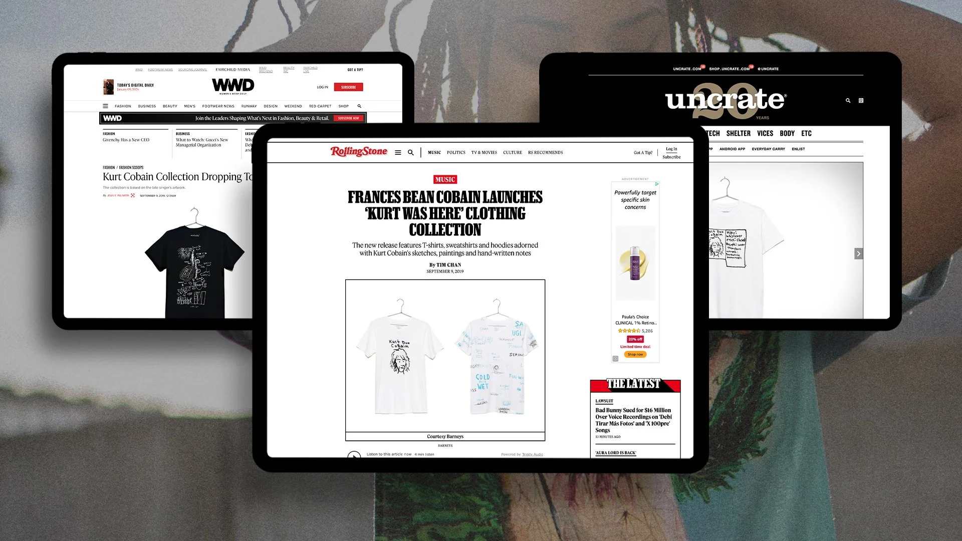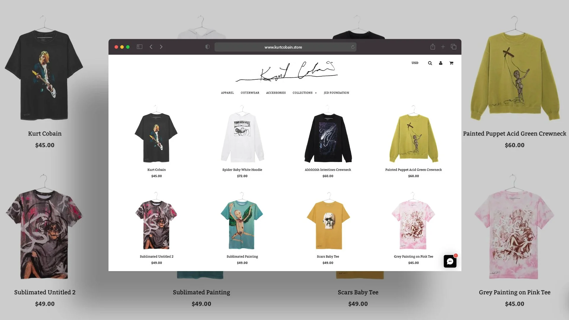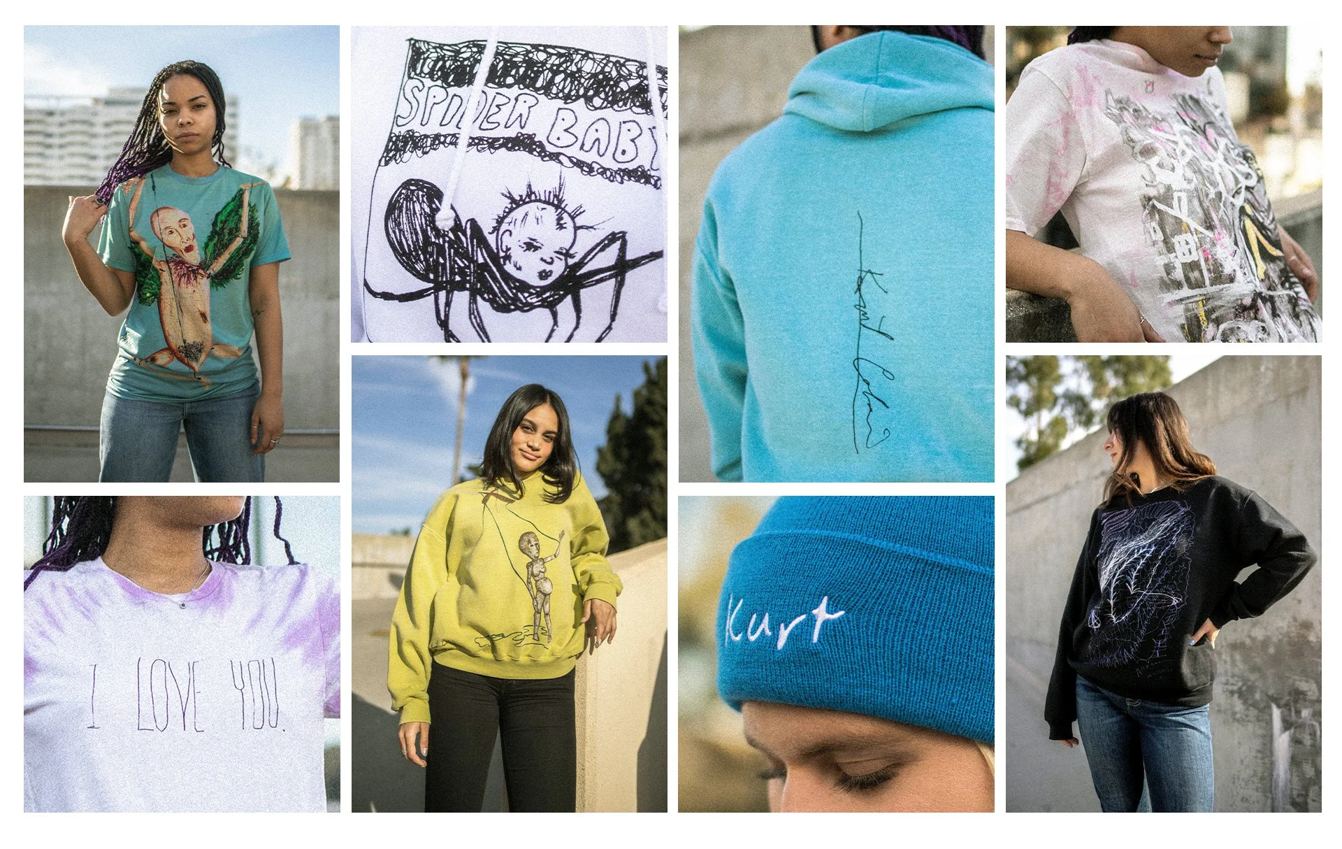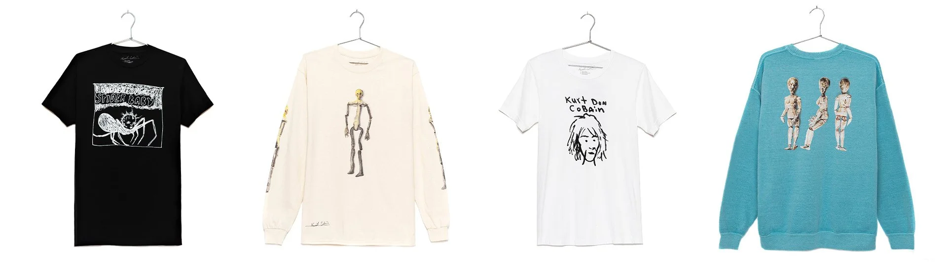 “Kurt the Artist” was a 16-piece merchandise collection celebrating the original artwork of Kurt Cobain, featuring apparel and accessories sold exclusively online through Barney’s, Selfridges, the Kurt Cobain store, and later Urban Outfitters. The campaign aimed to create a visually compelling digital presence that highlighted Kurt’s artwork while driving e-commerce conversion. As the sole creative, I shot and retouched all product and lifestyle imagery, making a deliberate choice to display the apparel on a naturally draped hanger, elevating the presentation and giving the collection a luxurious, art-forward feel. These images were used across all sites, PDP pages, marketing campaigns, press coverage including Rolling Stone, WWD, and Uncrate, and in a curated book celebrating Kurt’s original work.